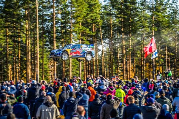 WRC Rally Finland. Ford driver Adrien Fourmaux records a 68 meter jump.