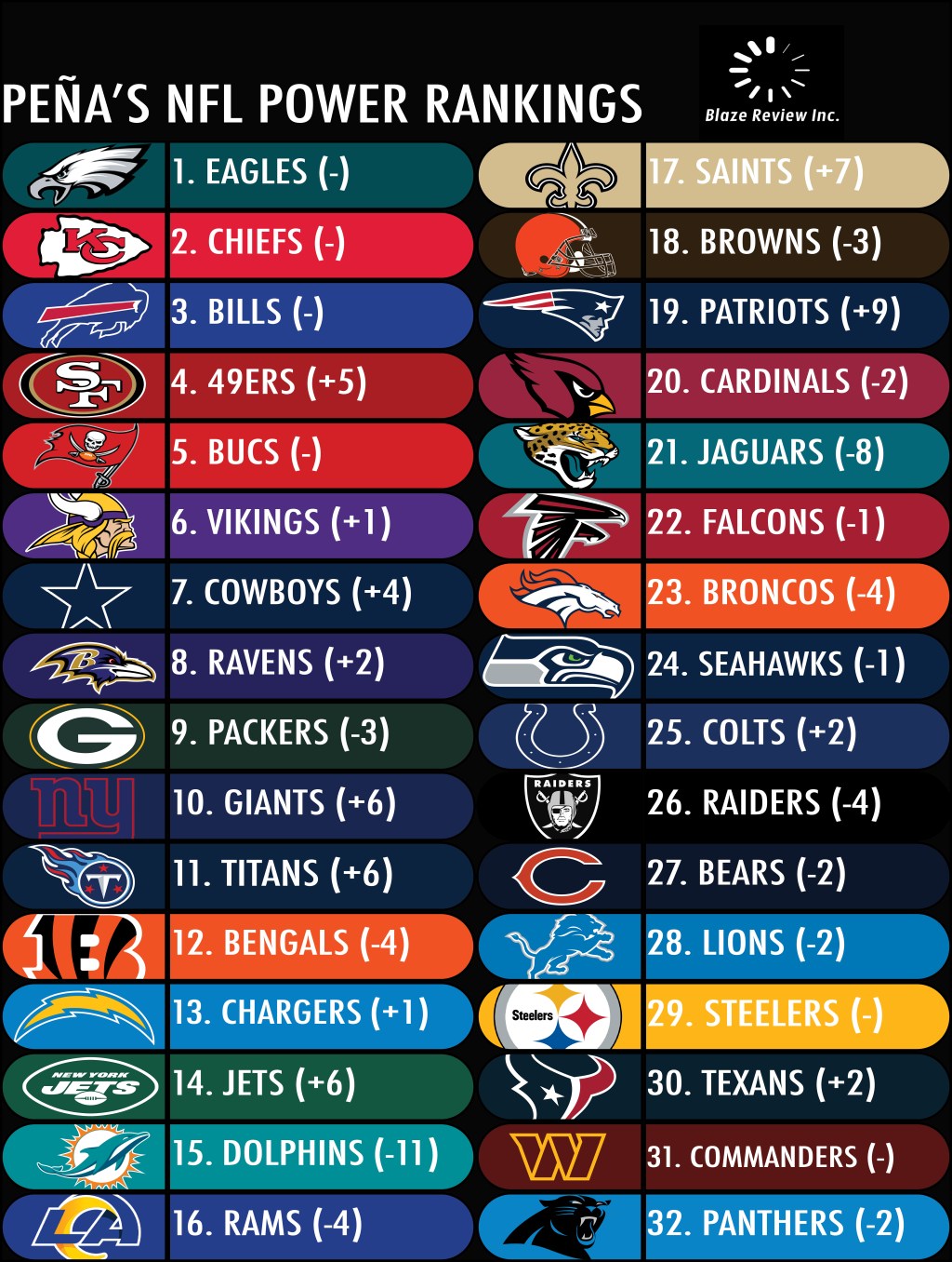 Geno Smith and The Seattle Seahawks offense has been a major surprise this season. A career backup, Smith is playing better than his predecessor Russell Wilson this season. If only their defense could play a little better, they would certainly be higher in the rankings. A season ending injury to Rashaad Penny made matters even worse.